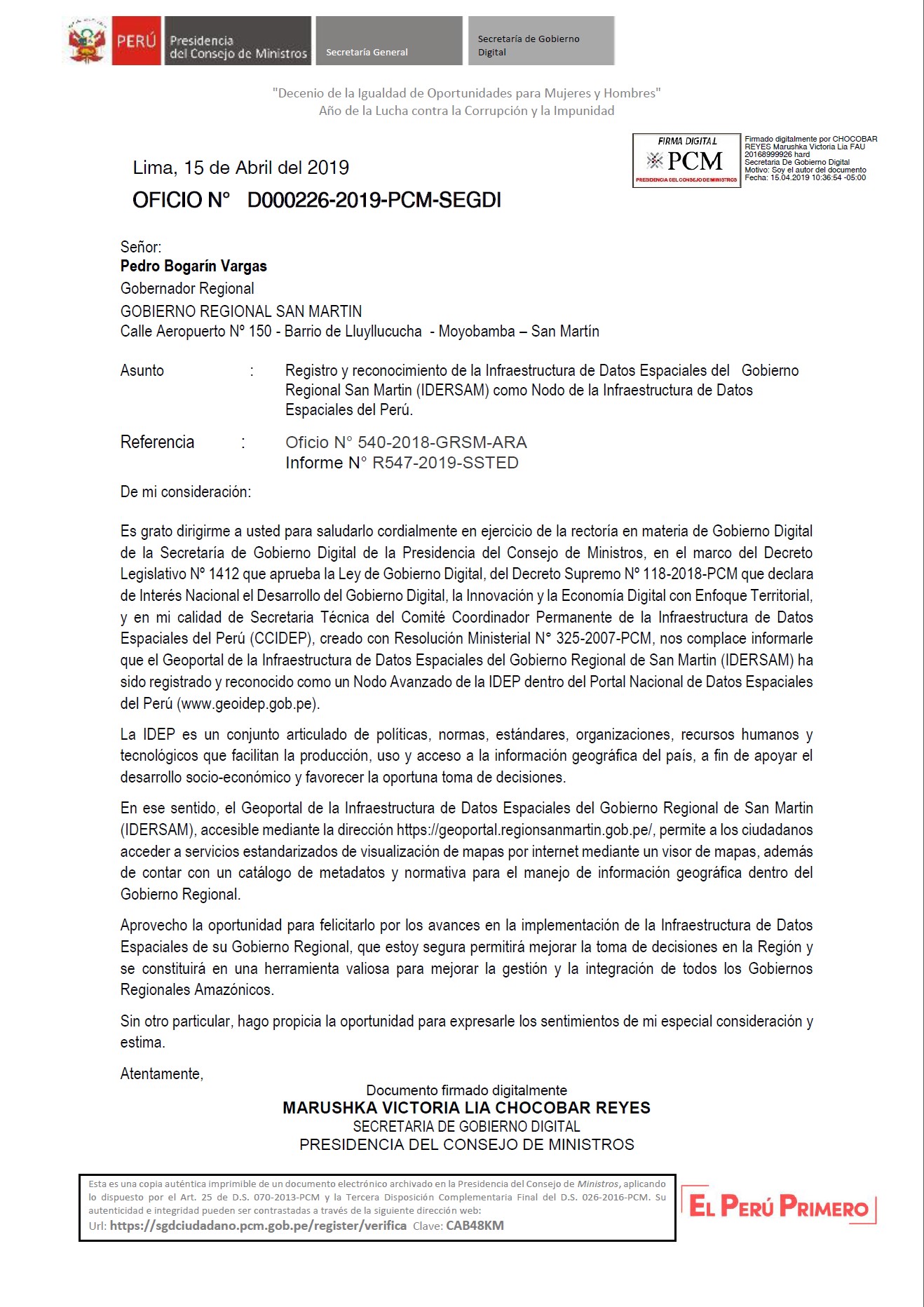 Registro y reconocimiento de la Infraestructura de Datos Espaciales del Gobierno Regional San Martin (IDERSAM) como Nodo de la Infraestructura de Datos Espaciales del Perú.