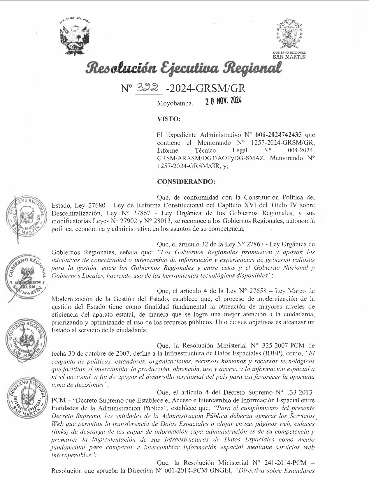 El Gobierno Regional San Martín, aprueba la conformación del Comité de Gestión de la Infraestructura de Datos Espaciales del Gobierno Regional San Martín, el cual queda estructurada por 01 presidente, 01 Secretario Técnico, y sus nodos, haciendo un total de 15 integrantes. Esta Resolución deja SIN EFECTO LEGAL, la Resolución Ejecutiva Regional N°406-2018-GRSM/GR de fecha 24 de julio de 2018; y, la Resolución Ejecutiva Regional N°442-2018-GRSM/GR de fecha 16 de agosto de 2018; asi como cualquier acto resolutivo que se oponga a la presente Resolución.
